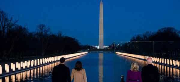দিনের শেষ লগ্নে অত্যস্ত ভাবগম্ভীর পরিবেশে নির্বাচিত প্রেসিডেন্ট জো বাইডেন এবং নির্বাচিত ভাইস প্রেসিডেন্ট কামালা হ্যারিস আমেরিকায় করোনা ভাইরাসে যে ৪লক্ষ মানুষ প্রাণ হারিয়েছেন তাদের স্মরণে লিংকন মেম্যোরিয়ালে আলোক প্রজ্বলন