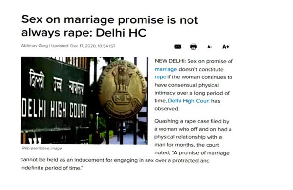 বিয়ের প্রতিশ্রুতিতে কোনো নারী নিজের ইচ্ছায় দীর্ঘদিন কারো সঙ্গে শারীরিক সম্পর্ক স্থাপন করলে তা ধর্ষণ বলে বিবেচিত হবে না বলে জানিয়েছেনAdd New দিল্লি হাইকোর্ট। খবর টাইমস অব ইন্ডিয়ার। এক যুবকের