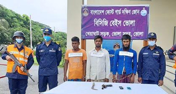 ভোলা জেলার উপজেলা সদরের তেতুলিয়া নদী থেকে দেশী পিস্তলসহ ৩ ডাকাতকে আটক করেছে কোষ্টগার্ড দক্ষিণ জোনের সদস্যরা। সোমবার রাত ১২টার দিকে ভেলুমিয়া ইউনিয়নের তেতুলিয়া নদীর ১৫ নং চর থেকে তাদের