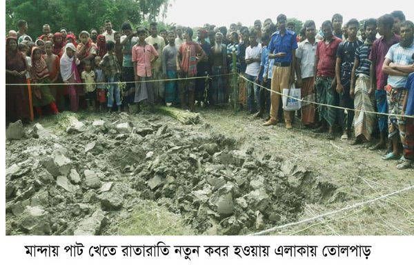 নওগাঁ প্রতিনিধি: নওগাঁর মান্দায় সদ্য কেটে নেওয়া পাটের খেতে রাতারাতি একটি কবর খনন করা হয়েছে। আজ বৃহস্পতিবার সকালে কবরটি এলাকাবাসীর নজরে আসার পর তোলপাড় শুরু হয়। ঘটনাটি ঘটেছে উপজেলার কাঁশোপাড়া