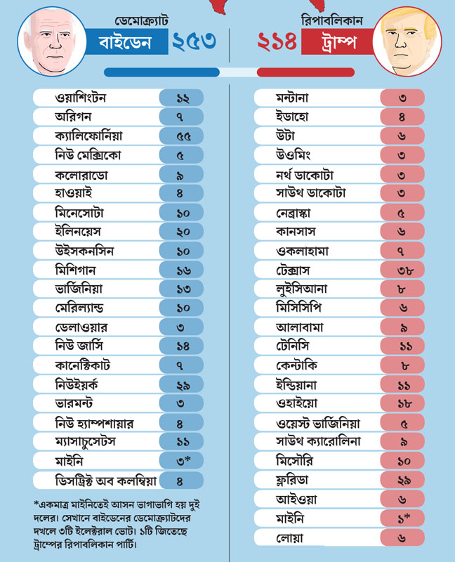 ইলেক্টরাল ভোটের নিরিখে কোন রাজ্য কোন দলের দখলে, এই বিচার করতে বসলেও কিন্তু হিসেবটা প্রায় অর্ধেক অর্ধেক। সবচেয়ে বড় রাজ্য ক্যালিফোর্নিয়ার ৫৫টি আসন বরাবরই ডেমোক্র্যাটদের দখলে থাকে। এ বারও ব্যতিক্রম হয়নি। মিশিগান ও উইসকনসিন ছাড়া ভোটের প্রবণতায় পরিবর্তন প্রায় নেই বললেই চলে। ডেমোক্র্যাট এবং রিপাবলিকান— দুই দলই নিজেদের ঘাঁটি ধরে রাখতে পেরেছে।