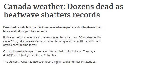 টানা তৃতীয় দিনের মতো কানাডায় সর্বোচ্চ তাপমাত্রা রেকর্ড করা হয়েছে। মঙ্গলবার ব্রিটিশ কলাম্বিয়ার লায়টনে ৪৯ দশমিক ৬ ডিগ্রি সেলসিয়াস তাপমাত্রা রেকর্ড করা হয়। এ সপ্তাহের আগে কানাডার তাপমাত্রা কোনোদিনই ৪৫ ডিগ্রি সেলসিয়াস পার হয়নি।
