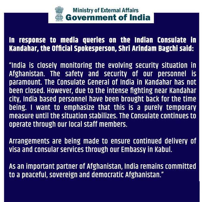 ভারতের বিদেশ মন্ত্রকের মুখপাত্র অরিন্দম বাগচী এক টুইট বার্তায় জানান, কান্দাহার পুরোপুরি বন্ধ করে দেওয়া হচ্ছে না। এখন কান্দাহারে তালিবান ও আফগান সরকারি বাহিনীর মধ্যে সংঘর্ষ চলছে। নিরাপত্তার কথা বিবেচনা করে আমরা আপাতত সাময়িকভাবে কান্দাহার মিশন থেকে ভারতীয় কর্মচারীদের ফিরিয়ে এনেছি। তবে দূতাবাসের কাজকর্ম চালানোর জন্য ওখানকার আফগান কর্মীরা থাকছেন। ভিসা ও অন্যান্য প্রয়োজনে কাবুলের ভারতীয় দূতাবাস সবরকম সাহায্য করবে।